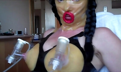 Spandex rubber doll in fuck-rubber dress.